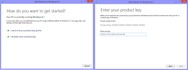 I was forced into Windows 8.1 by a traitorous computer running XP that turned on me and failed. With some practice I was able to move around Windows 8.1 with a certain amount of comfort. Not with like, mind you; just comfort. I found a function to add features to Windows 8.1—quite by accident. When I tried it, I received the window in the following Figure to the left. The bottom of my PC did not have the Microsoft XXXX-XXXX-XXXx-ad naseum key required by Microsoft on the label. I searched the computer system information and found the only key I could find. I pressed the I Already Have a Key button and my key was not accepted in the Window that resulted shown in the Figure to the right.